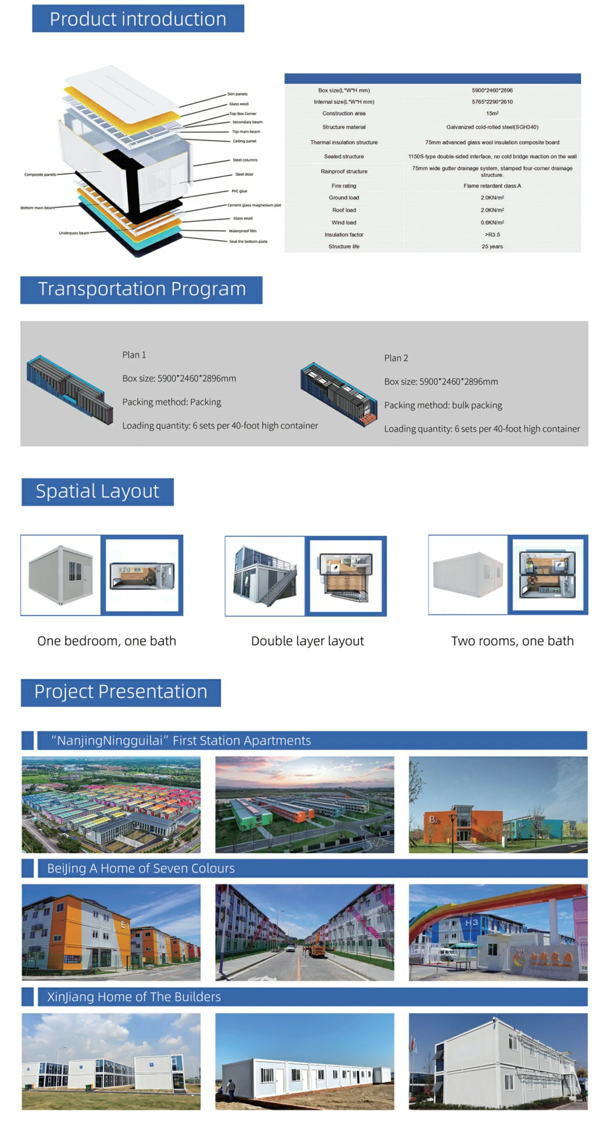 Box-type houses are the products with the largest export volume of our company, because this product can be infinitely connected horizontally and vertically, and the interior area can be made into various sizes by reducing wall panels to meet the requirements of various usage scenarios. The overall structure is extruded using high-strength steel profiles and then welded by oxygen dioxide to form a solid main structure, which can effectively withstand 12-magnitude winds and 10-magnitude earthquakes. The only disadvantage is that on-site construction is difficult and requires professional training. Usually after customer places the order, can arrange construction personnel to our company to train installation skills, or our company arrange professionals to go to the site to assist in the construction.